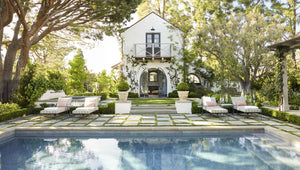 “I choreographed everything based on the lot,” says White, who thinks about floor plans “in a theatrical way, creating focal points that will pull your eye across the garden.” One such centerpiece is the poolhouse, an English country–inspired folly housing private guest quarters and an airy second-floor office. “I love seeing the white plaster silhouetted against a backdrop of big pines and eucalyptus,” he says.