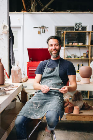 A portrait of ceramicist Natan Moss in his ceramics studio - he's wearing an apron and there are ceramics in the background.