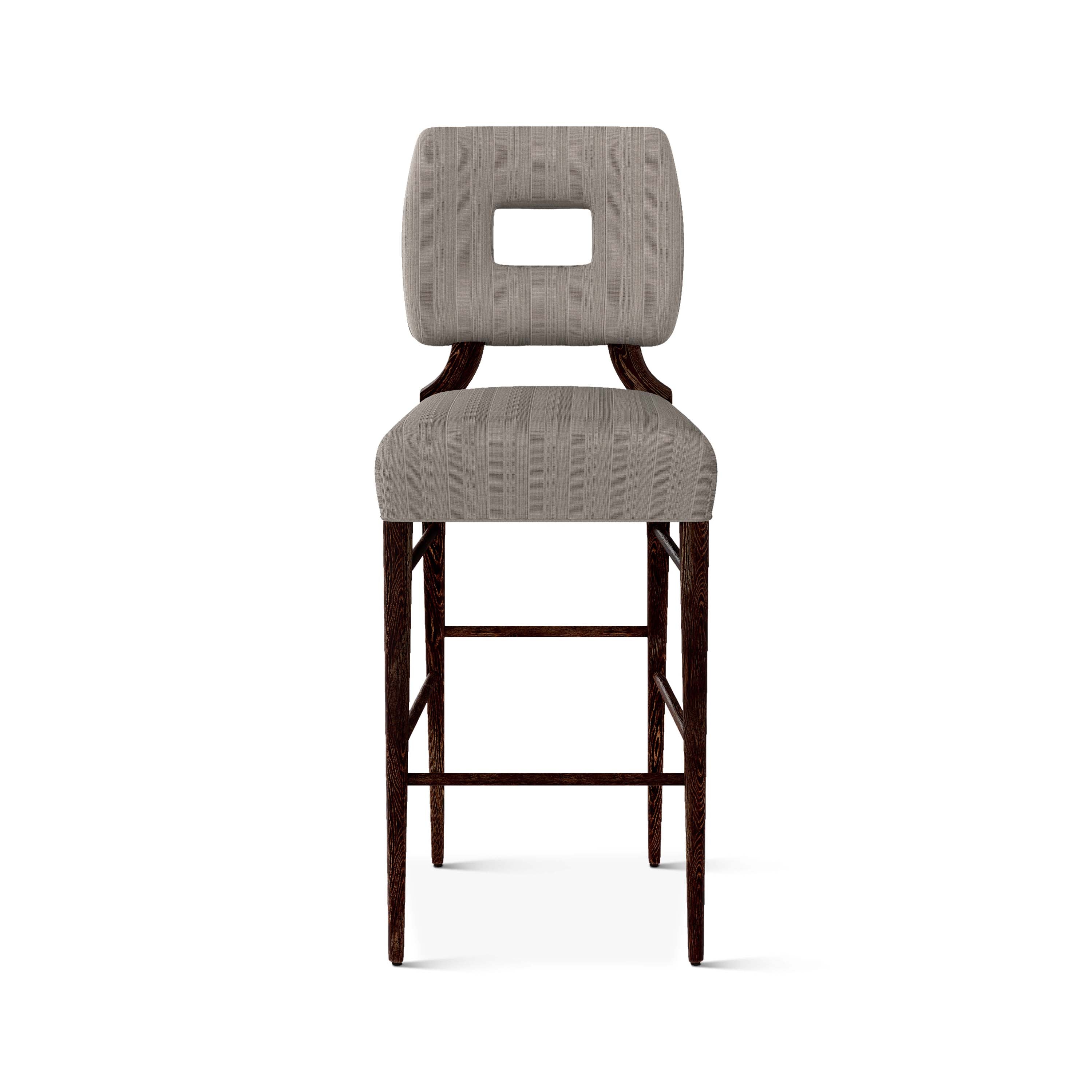 An upholstered, bar-height riff of a chair bought at a Hollywood memorabilia auction and attributed to legendary designer, T. H. Robsjohn-Gibbings. The original was made famous in a scene of the 1953 hit movie How to Marry a Millionaire featuring Lauren Bacall and Marilyn Monroe. This barstool is available in one of our six indoor/outdoor performance textiles, otherwise requires customer's own material (COM). Please include COM fabric details in order notes at checkout.