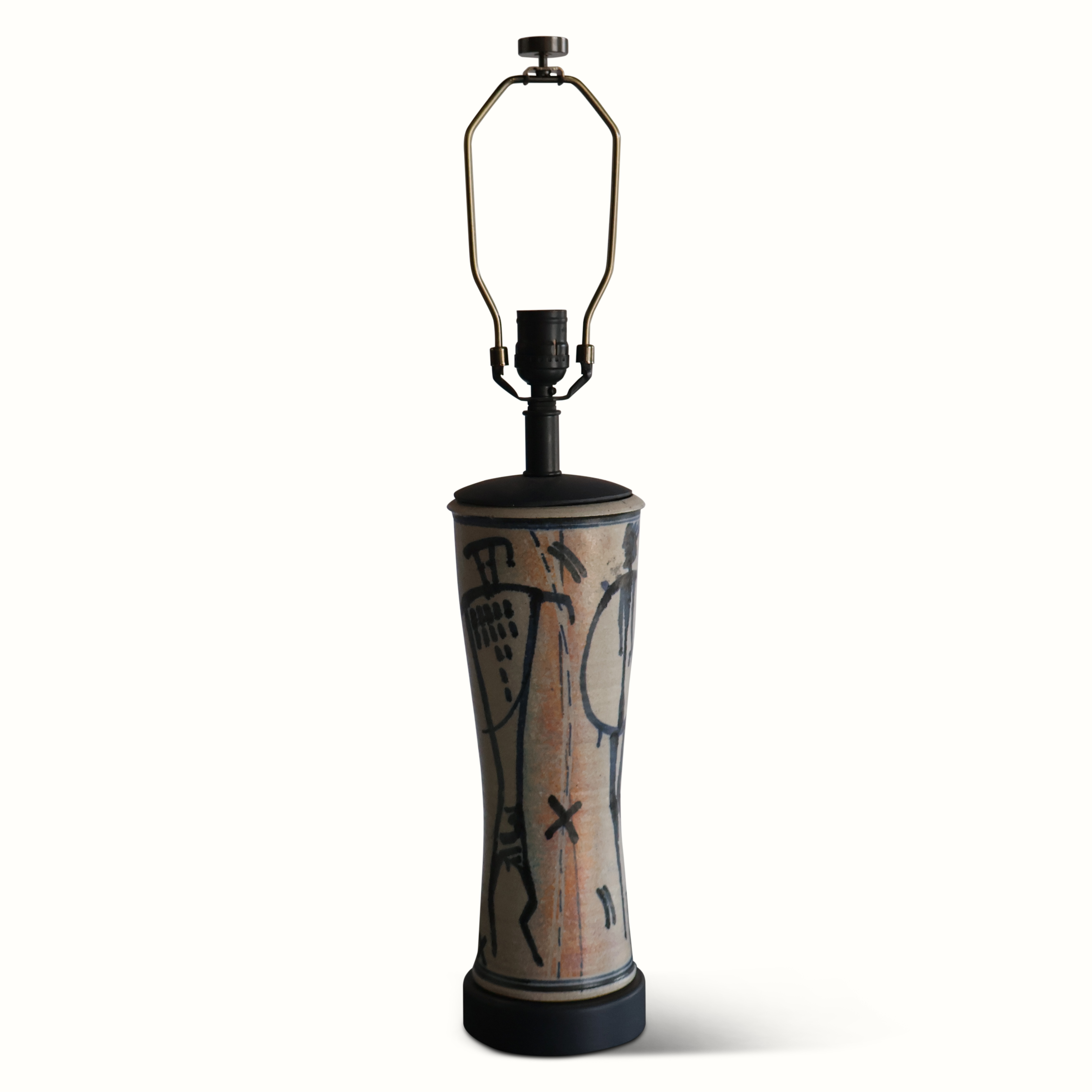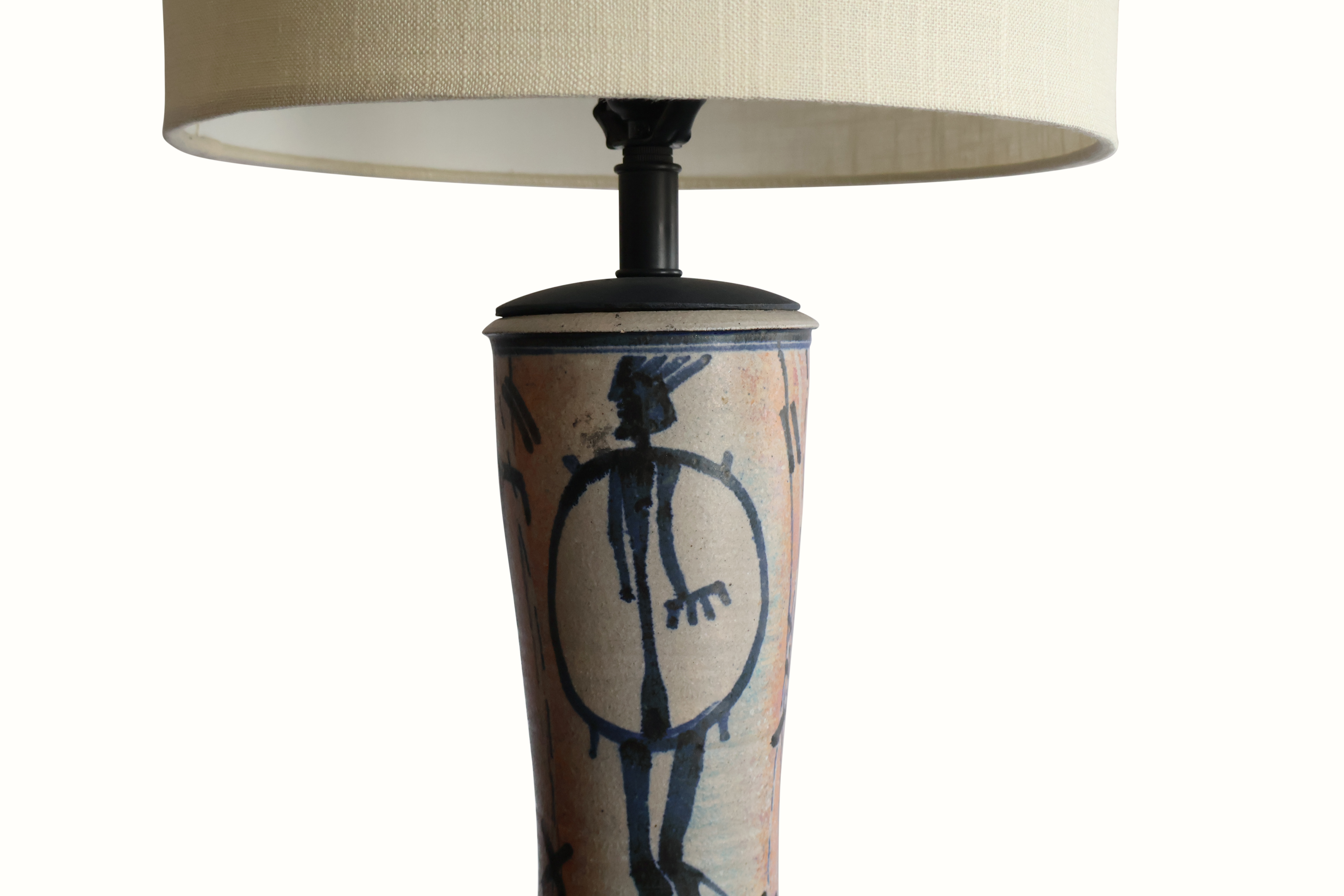 A vintage pottery lamp with hand painted designs. Newly rewired with a linen shade.