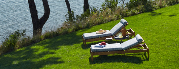 a pair of outdoor chaises on a grassy knoll near the ocean.