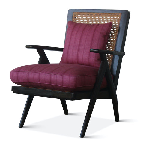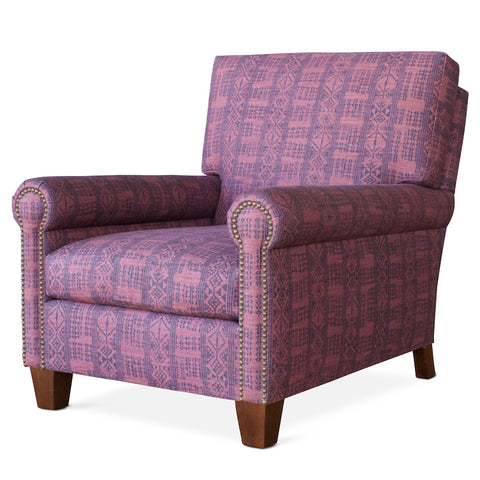 A seat arrangement with a wood and leather coffee table, a series of structural armchairs and a purple sofa. a pair of lamps and vintage art accessorize the space.