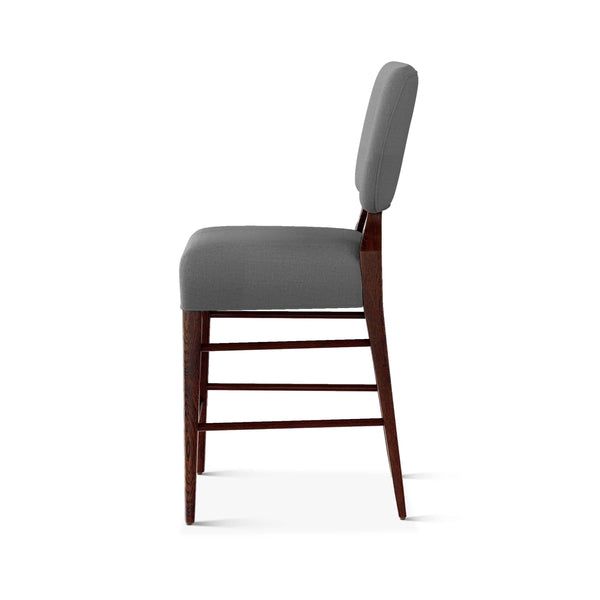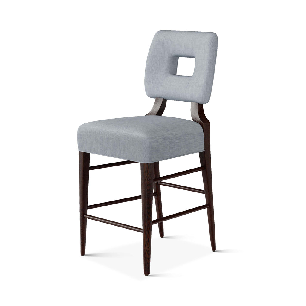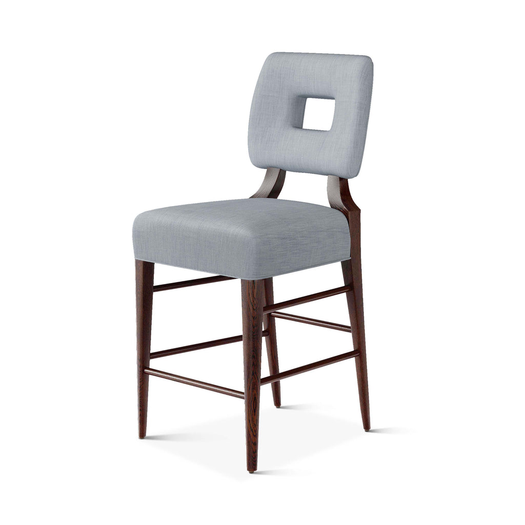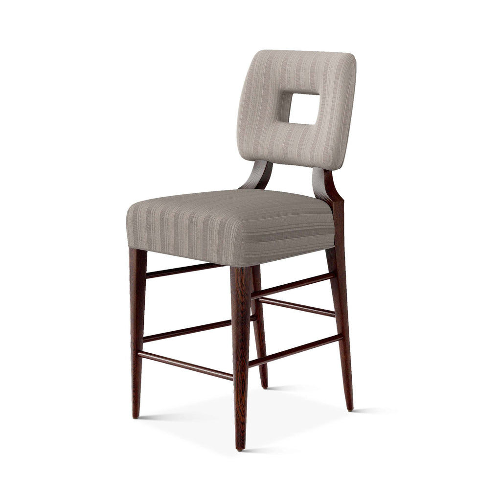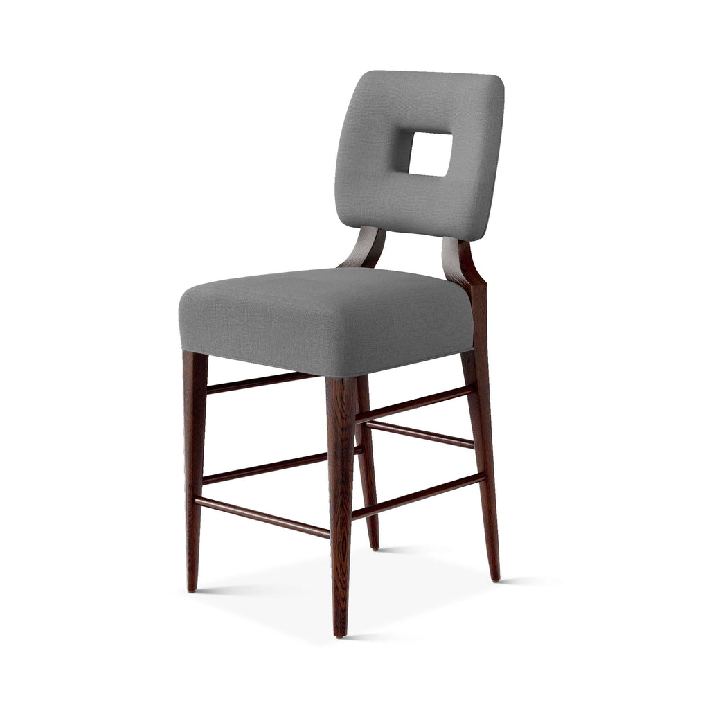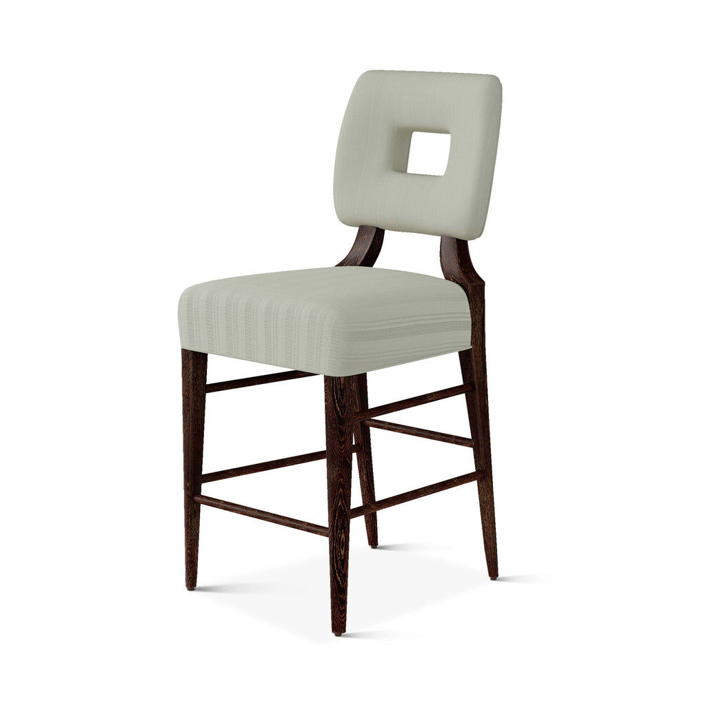 An upholstered, counter-height riff of a chair bought at a Hollywood memorabilia auction and attributed to legendary designer, T. H. Robsjohn-Gibbings. The original was made famous in a scene of the 1953 hit movie How to Marry a Millionaire featuring Lauren Bacall and Marilyn Monroe. The counter stool is available in one of our six indoor/outdoor performance textiles, otherwise requires customer's own material (COM). Please include COM fabric details in order notes at checkout.