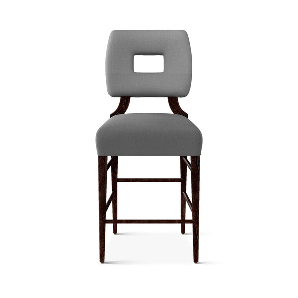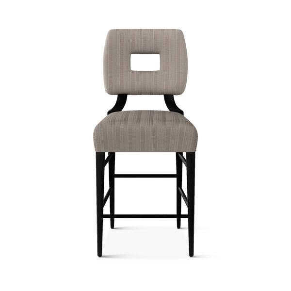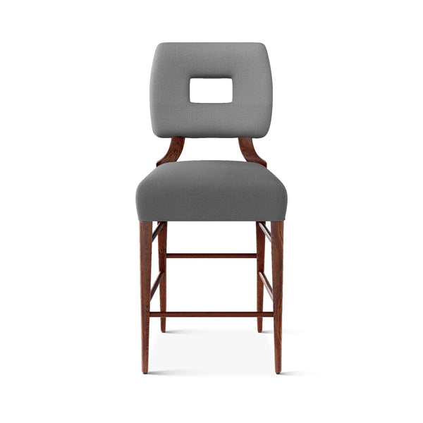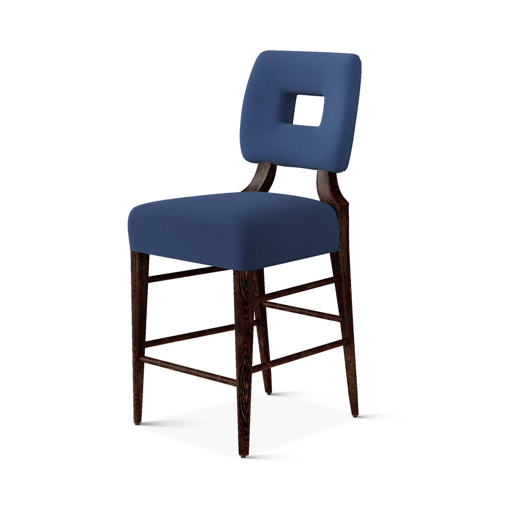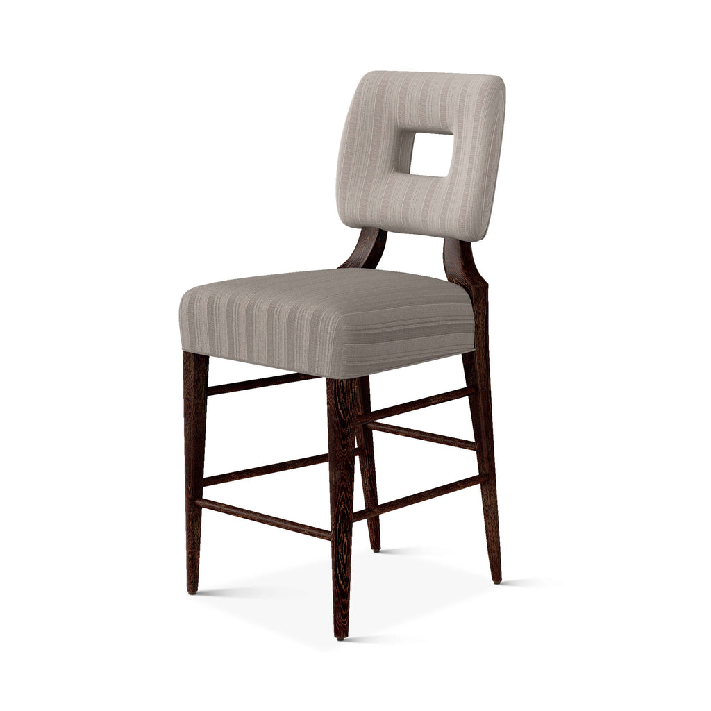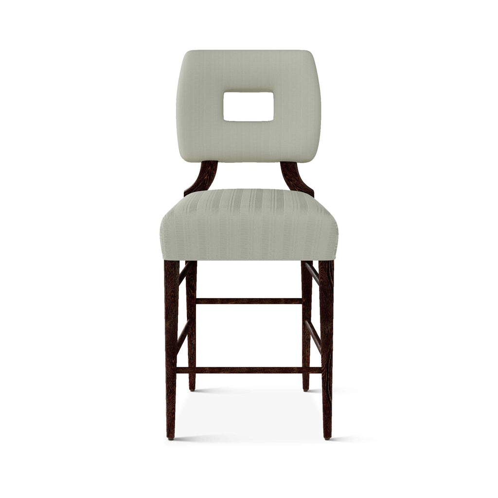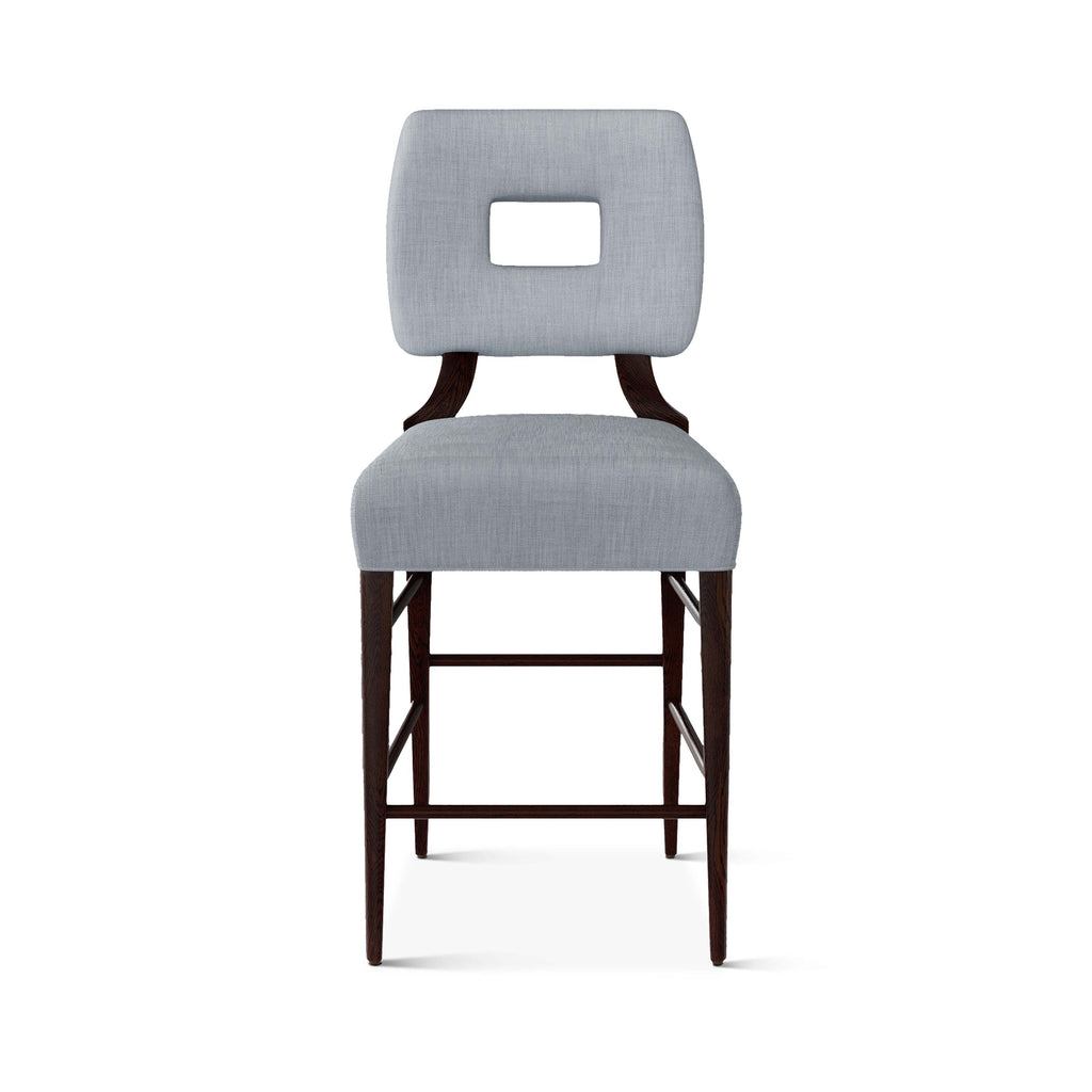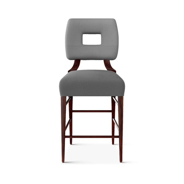 An upholstered, counter-height riff of a chair bought at a Hollywood memorabilia auction and attributed to legendary designer, T. H. Robsjohn-Gibbings. The original was made famous in a scene of the 1953 hit movie How to Marry a Millionaire featuring Lauren Bacall and Marilyn Monroe. The counter stool is available in one of our six indoor/outdoor performance textiles, otherwise requires customer's own material (COM). Please include COM fabric details in order notes at checkout.