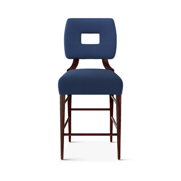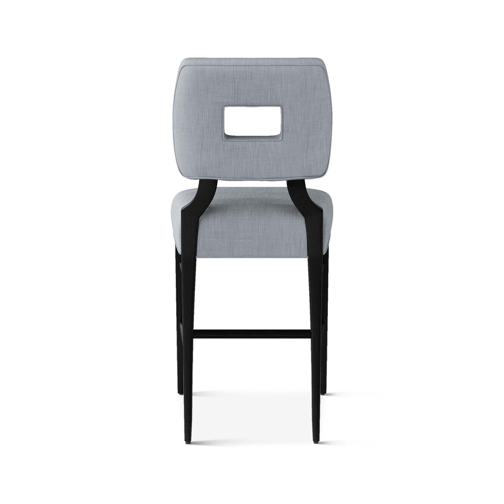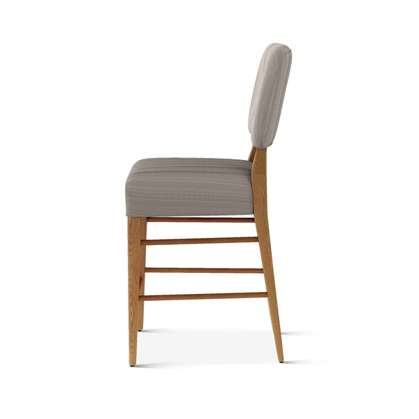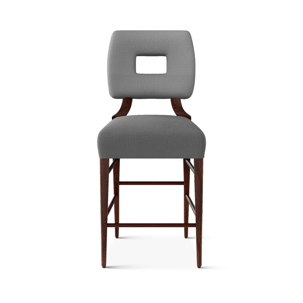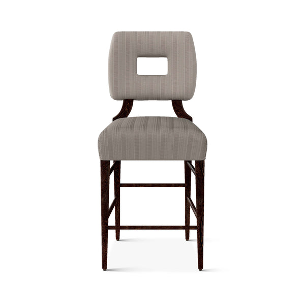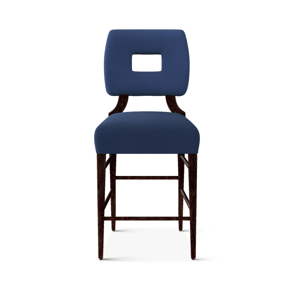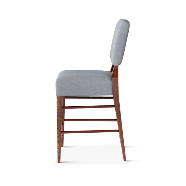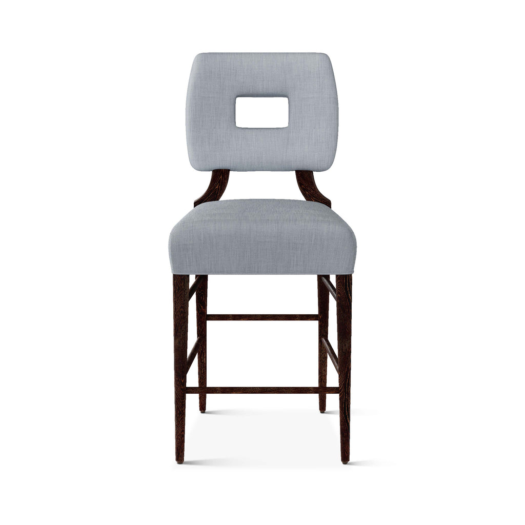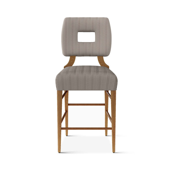 An upholstered, counter-height riff of a chair bought at a Hollywood memorabilia auction and attributed to legendary designer, T. H. Robsjohn-Gibbings. The original was made famous in a scene of the 1953 hit movie How to Marry a Millionaire featuring Lauren Bacall and Marilyn Monroe. The counter stool is available in one of our six indoor/outdoor performance textiles, otherwise requires customer's own material (COM). Please include COM fabric details in order notes at checkout.