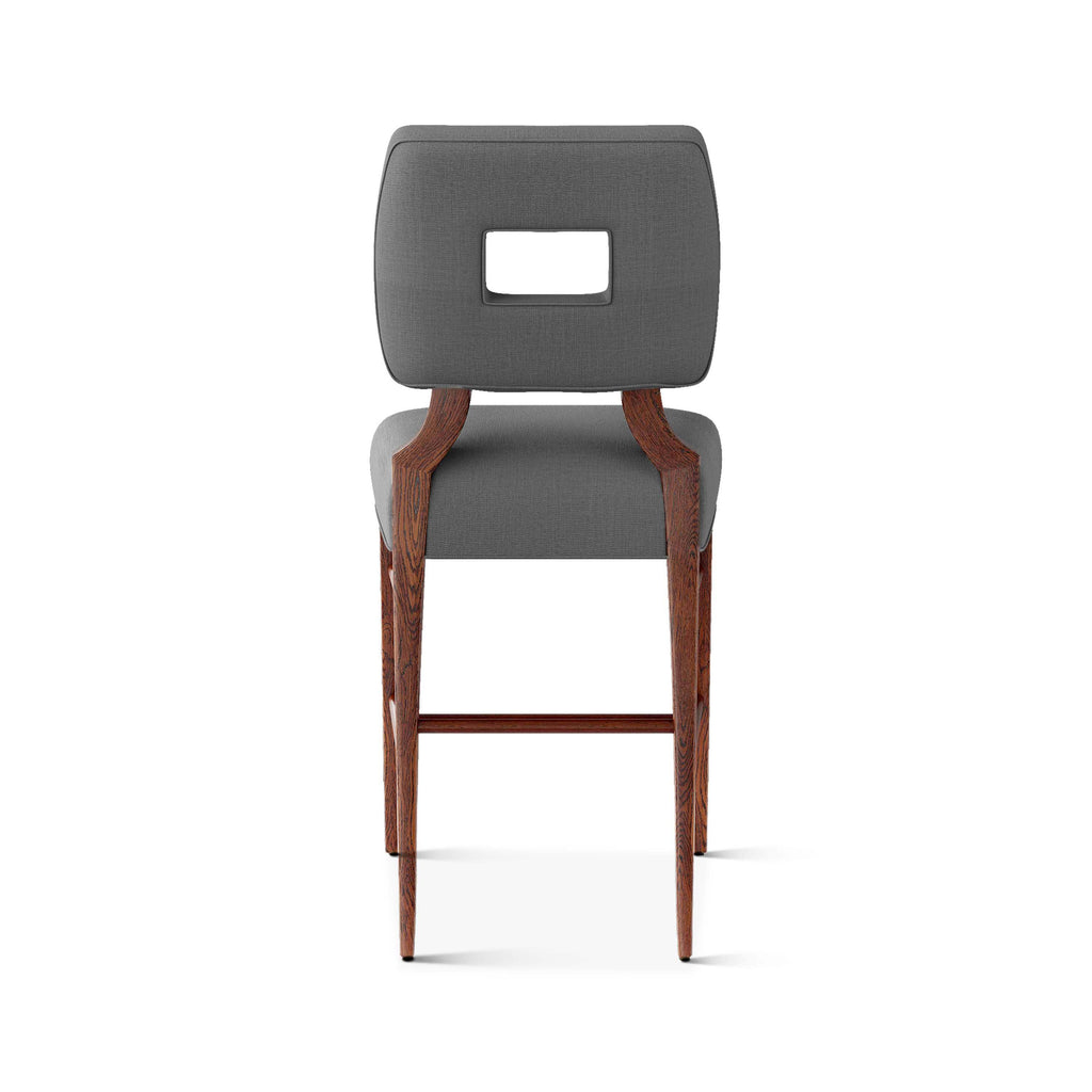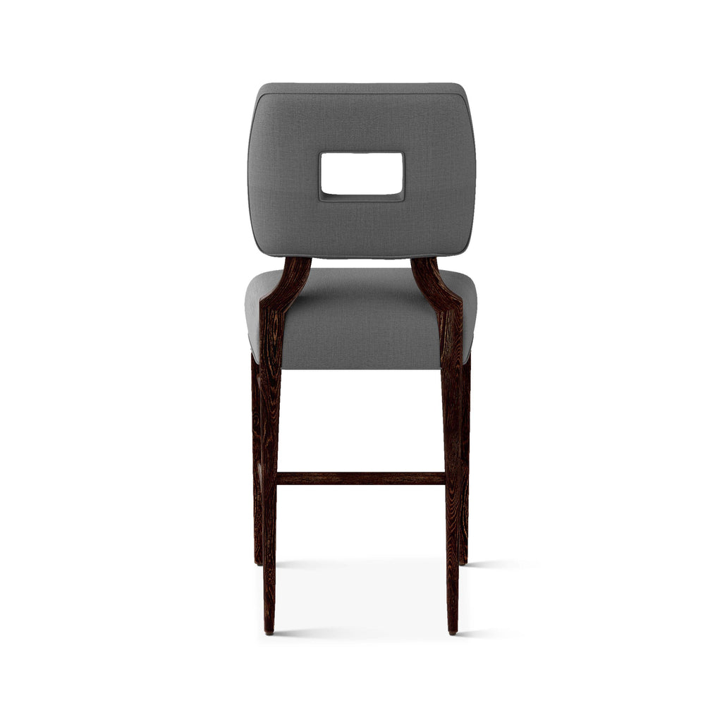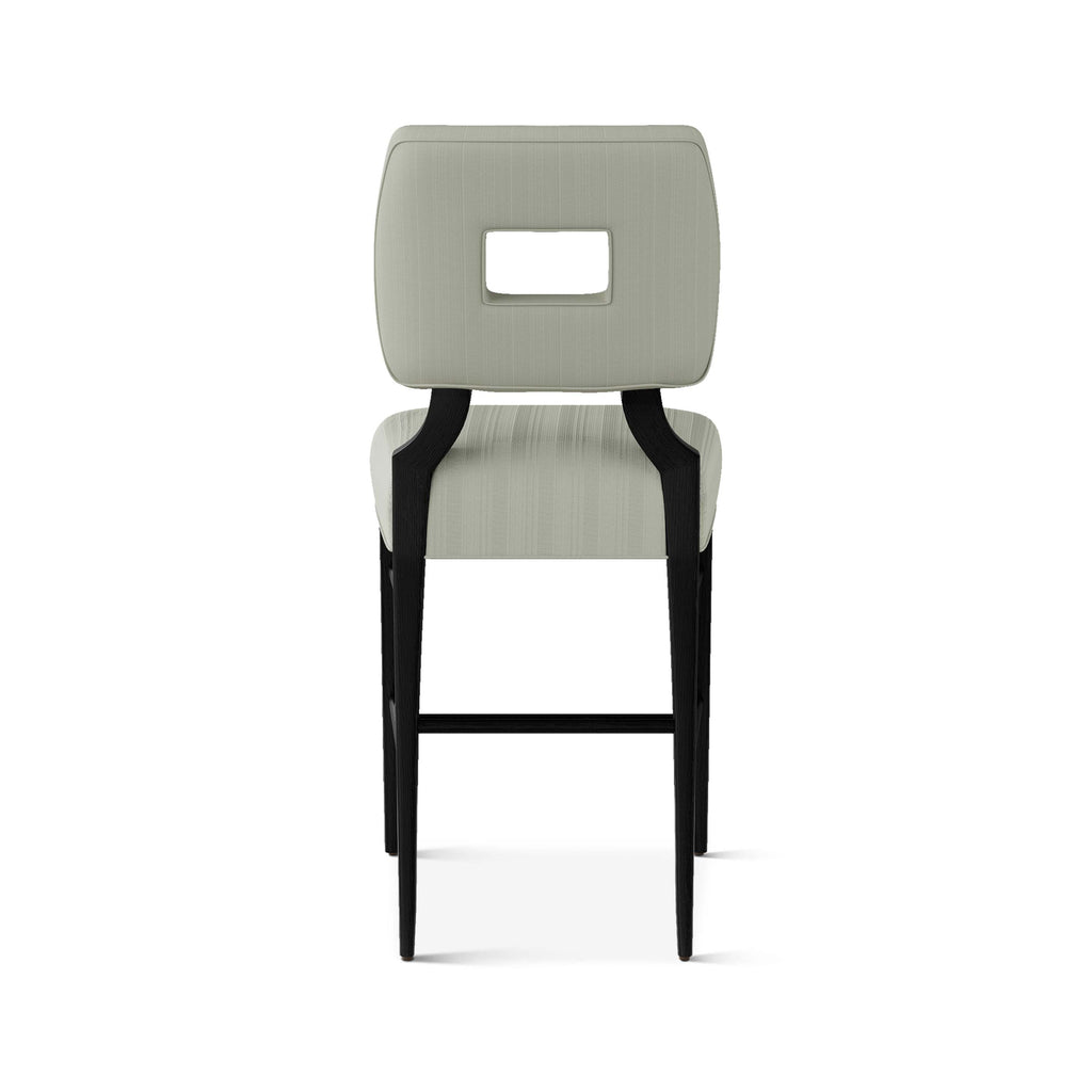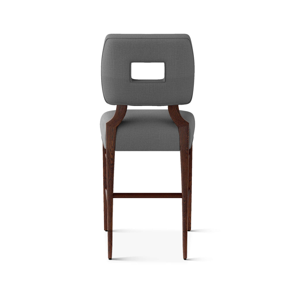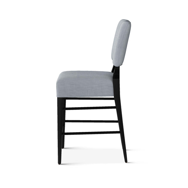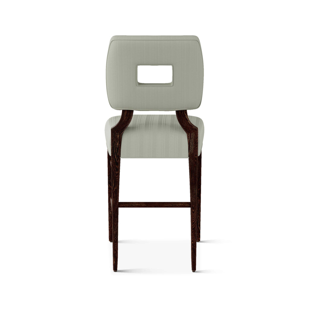 An upholstered, counter-height riff of a chair bought at a Hollywood memorabilia auction and attributed to legendary designer, T. H. Robsjohn-Gibbings. The original was made famous in a scene of the 1953 hit movie How to Marry a Millionaire featuring Lauren Bacall and Marilyn Monroe. The counter stool is available in one of our six indoor/outdoor performance textiles, otherwise requires customer's own material (COM). Please include COM fabric details in order notes at checkout.