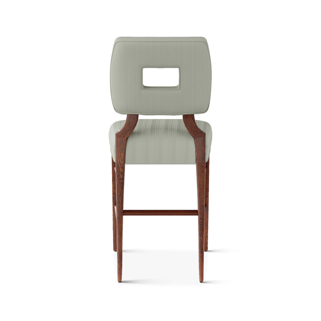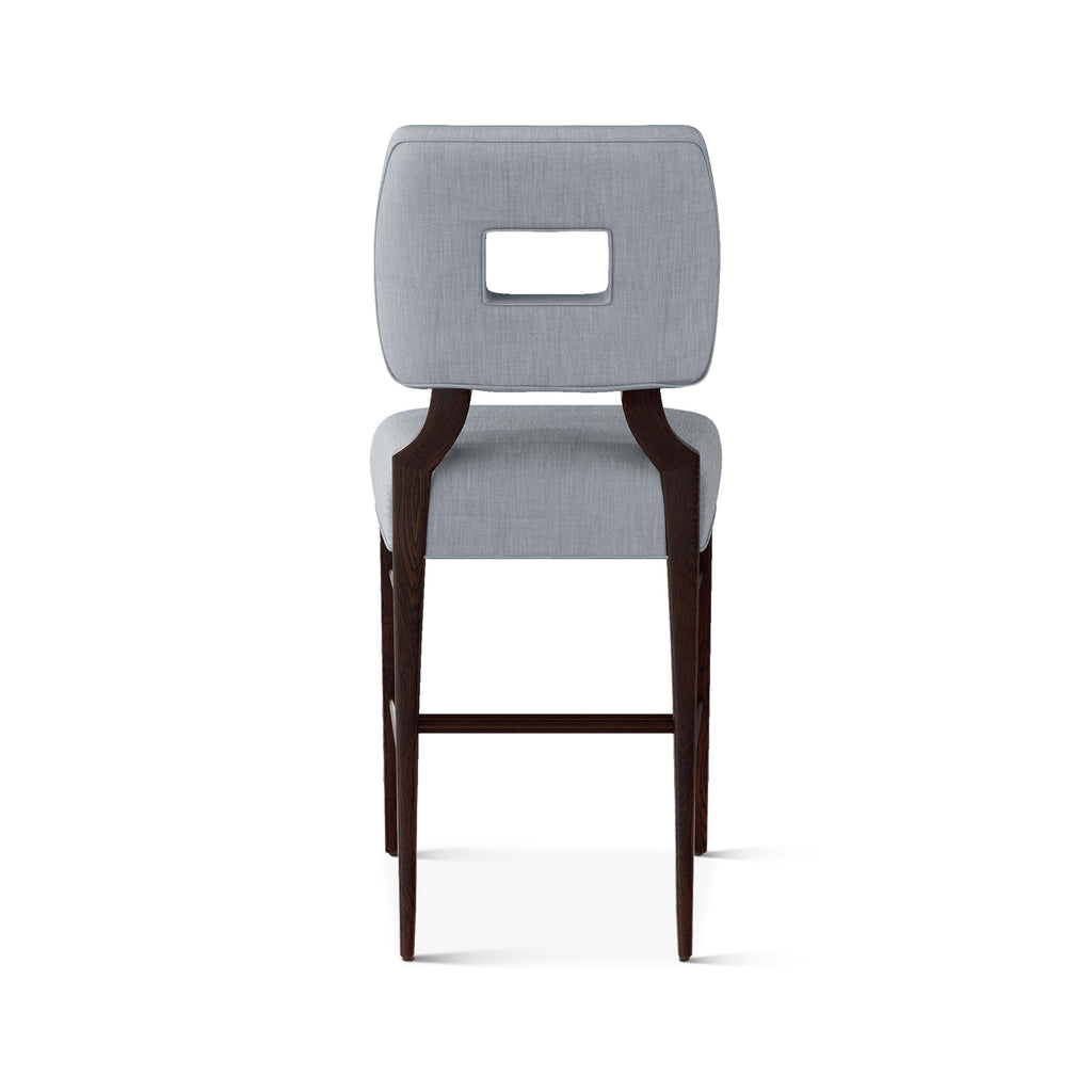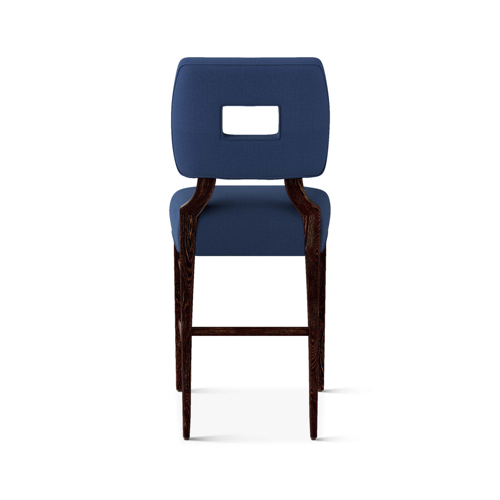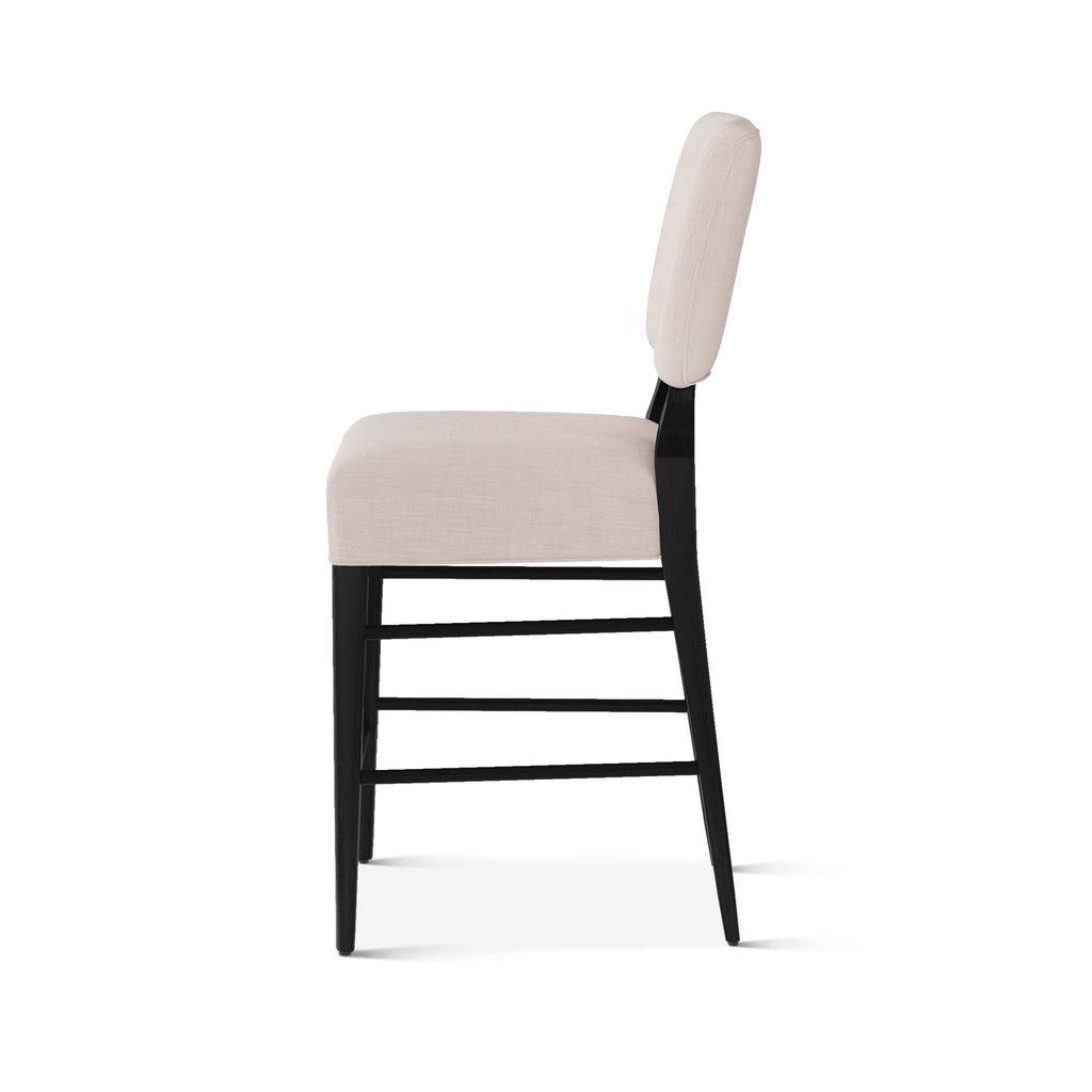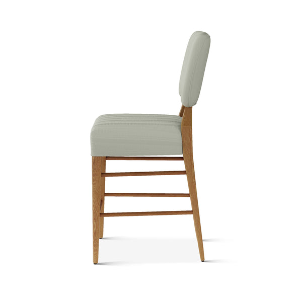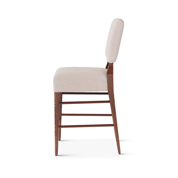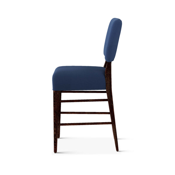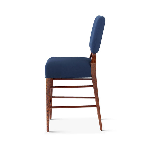 An upholstered, counter-height riff of a chair bought at a Hollywood memorabilia auction and attributed to legendary designer, T. H. Robsjohn-Gibbings. The original was made famous in a scene of the 1953 hit movie How to Marry a Millionaire featuring Lauren Bacall and Marilyn Monroe. The counter stool is available in one of our six indoor/outdoor performance textiles, otherwise requires customer's own material (COM). Please include COM fabric details in order notes at checkout.