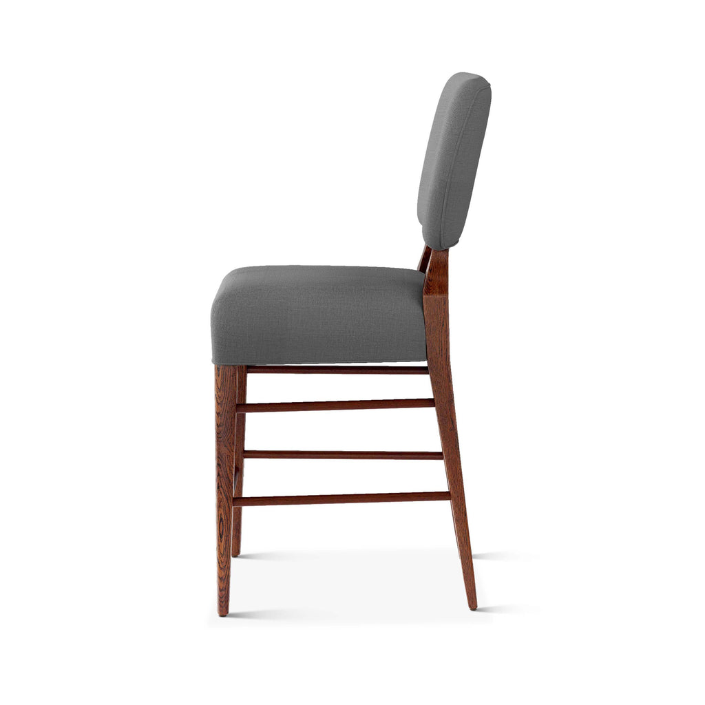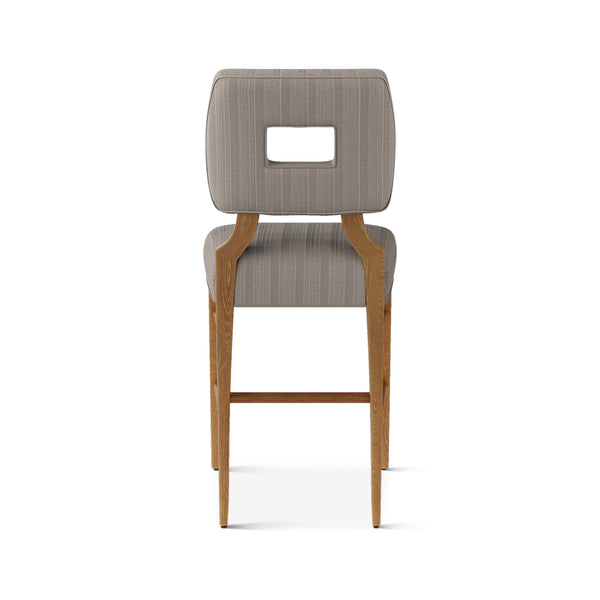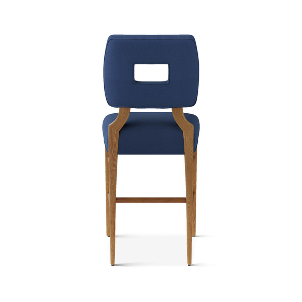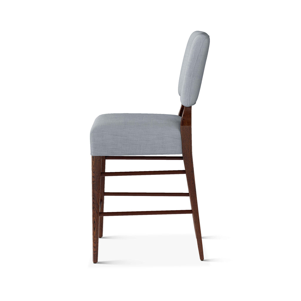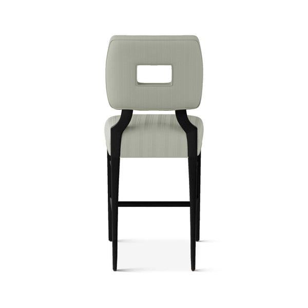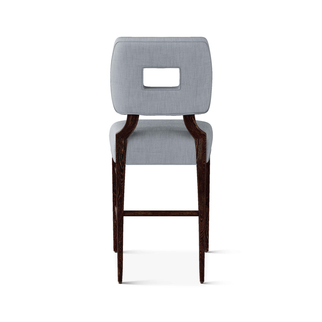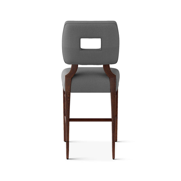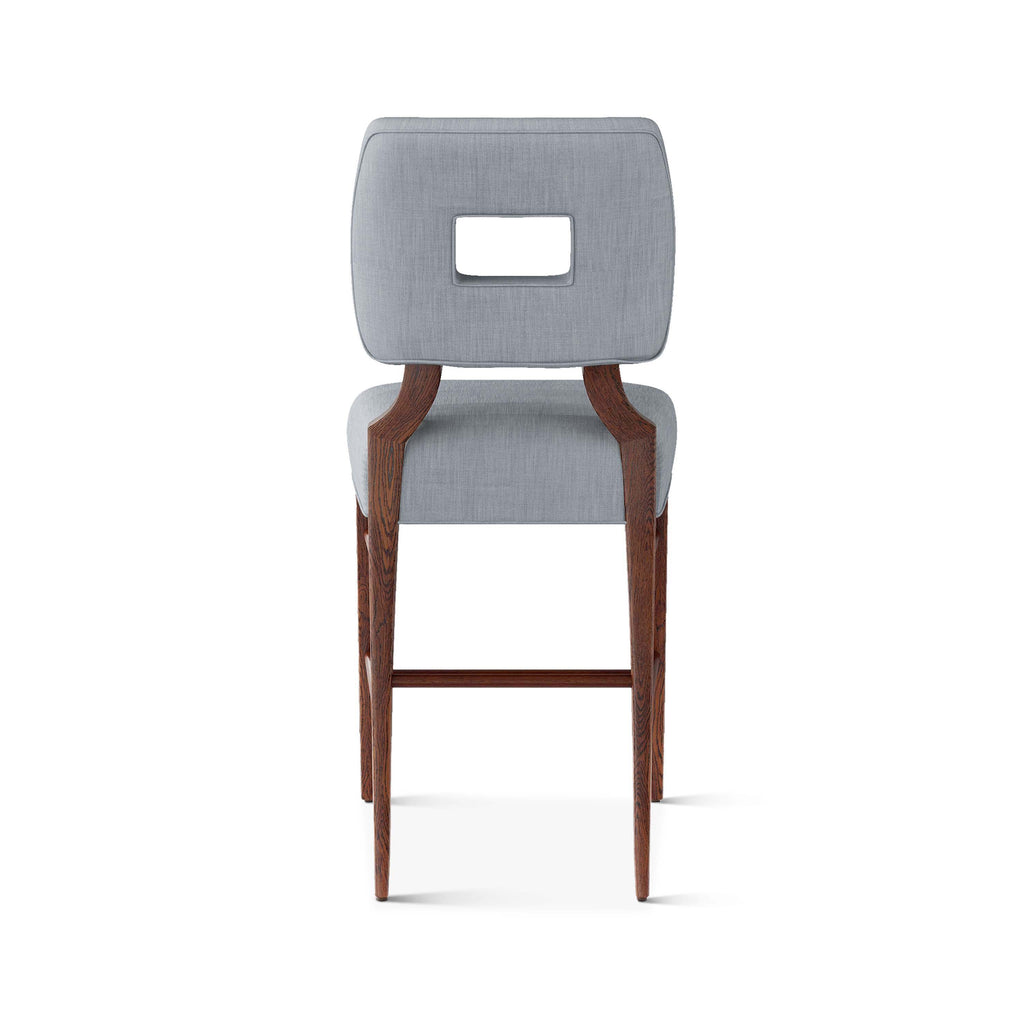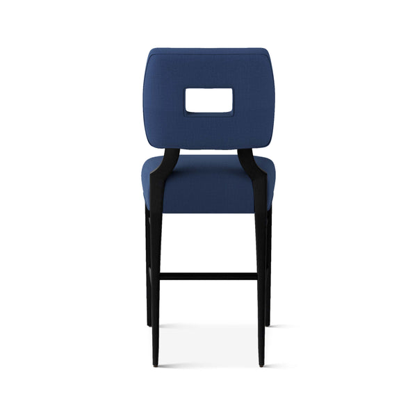 An upholstered, counter-height riff of a chair bought at a Hollywood memorabilia auction and attributed to legendary designer, T. H. Robsjohn-Gibbings. The original was made famous in a scene of the 1953 hit movie How to Marry a Millionaire featuring Lauren Bacall and Marilyn Monroe. The counter stool is available in one of our six indoor/outdoor performance textiles, otherwise requires customer's own material (COM). Please include COM fabric details in order notes at checkout.