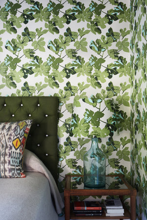 A bedroom covered in peter Dunham fig leaf pattern - on the walls and a matching lampshade. the headboard is green with a vintage pillow and gray bedspread.
