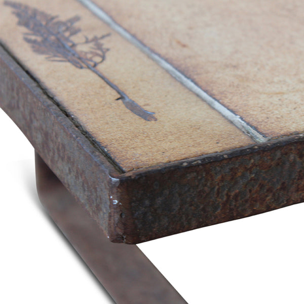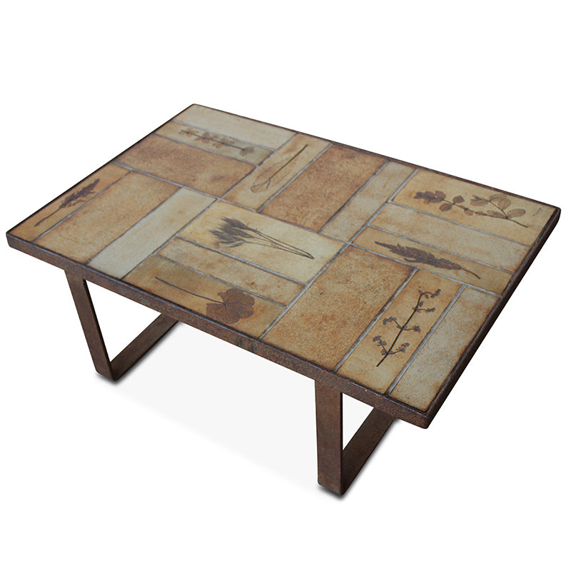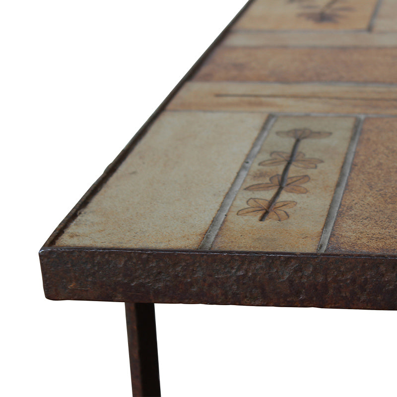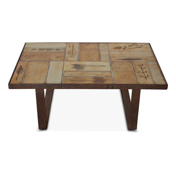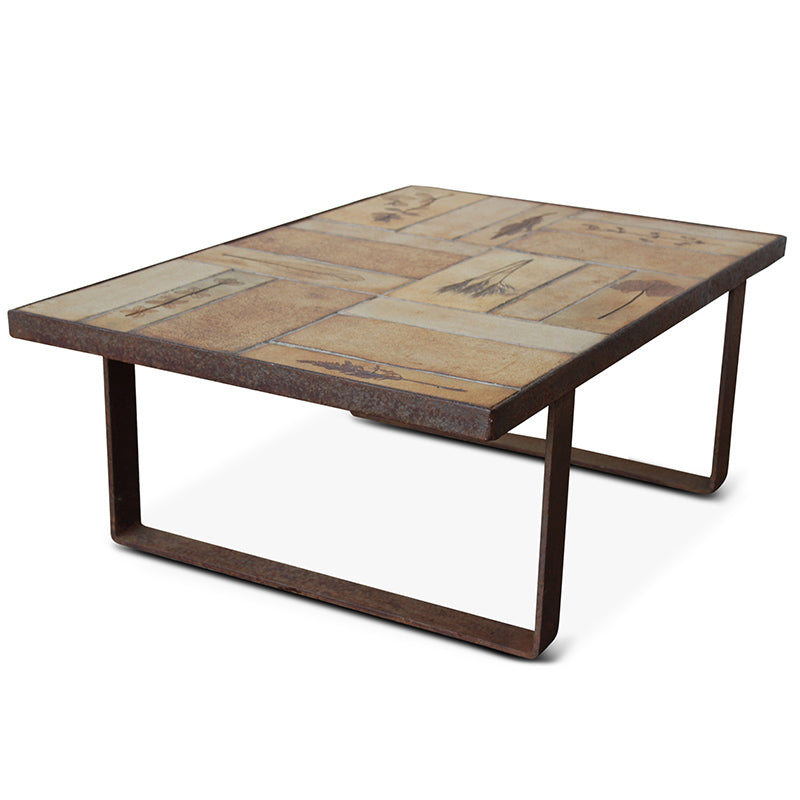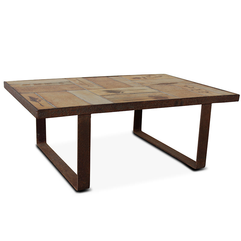 A vintage coffee table by Roger Capron. Features a hammered steel base and ceramic tiles with imprints. Steel base shows patina, and the ceramic tiles are all in excellent condition.