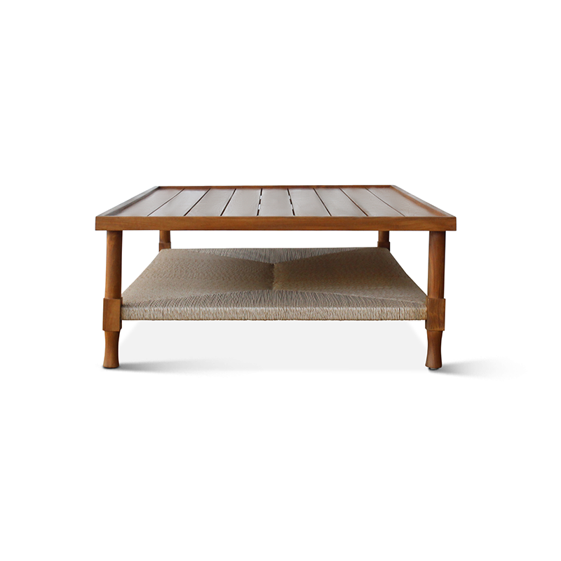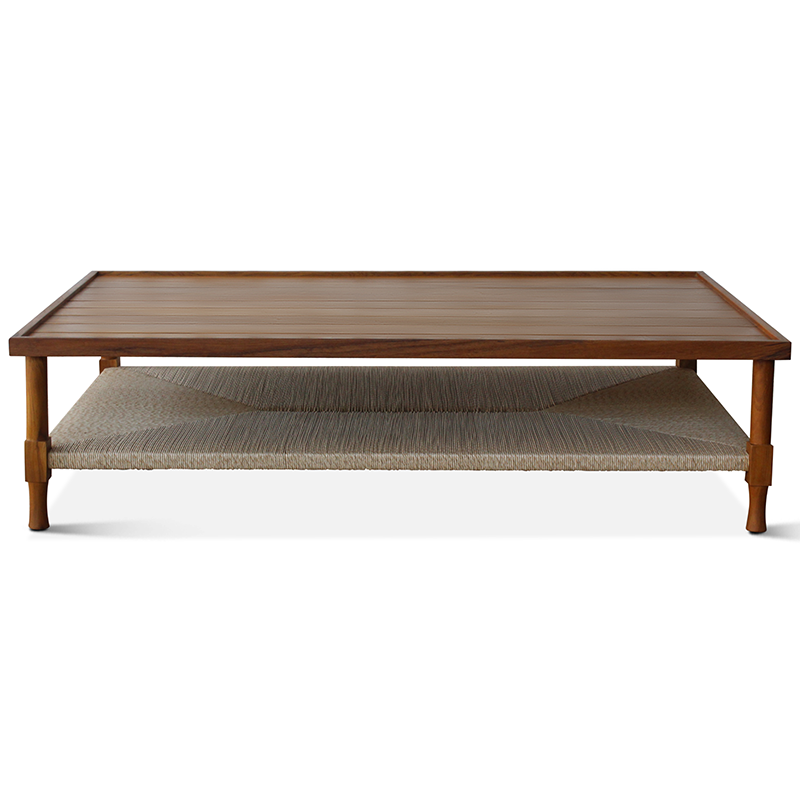 The teak Athletic Club Rectangular Coffee Table has hand-carved designer details and a sturdy handwoven shelf made from all-weather rush. A gallery rail surrounds the slatted top for a finished look, working beautifully for indoors or out. This piece is part of Peter Dunham Home, our collection of in-stock, hand-crafted furniture.