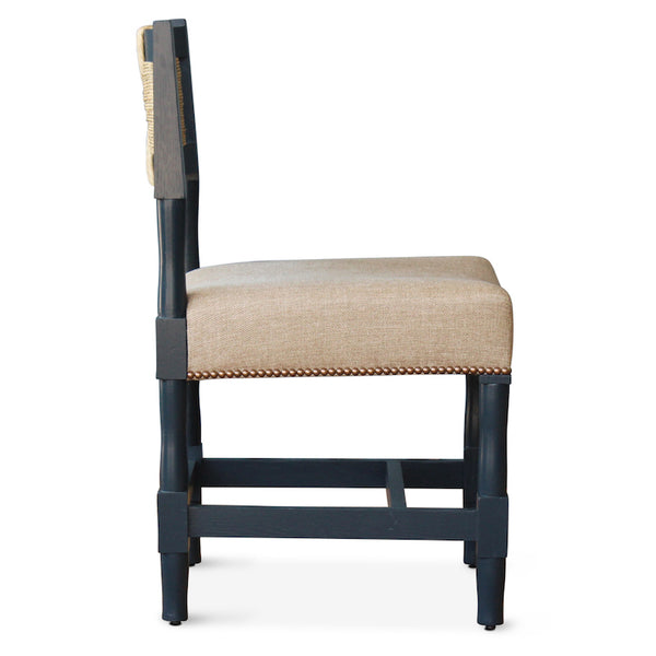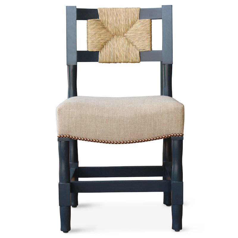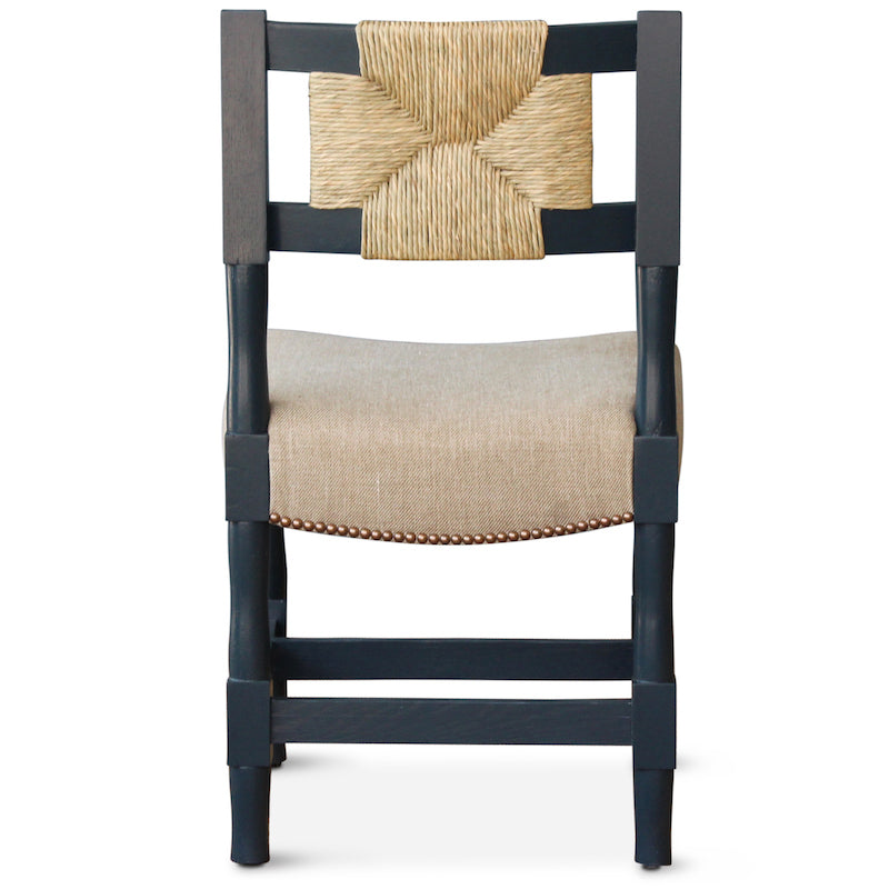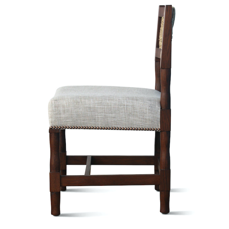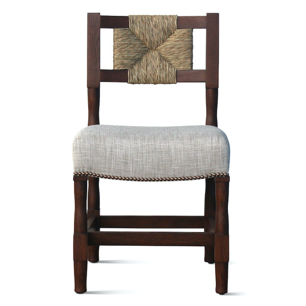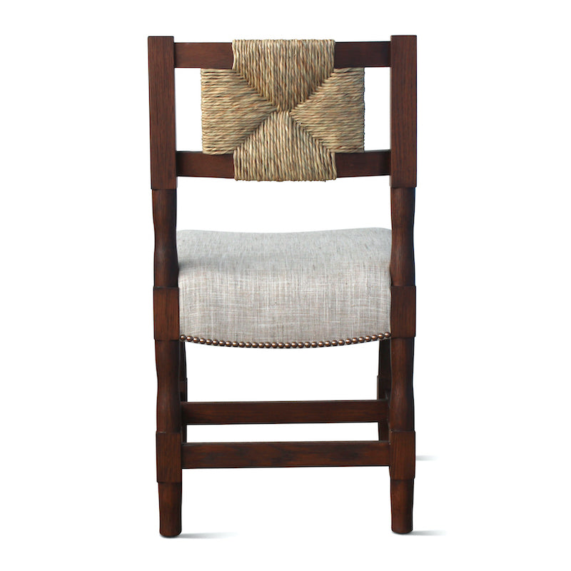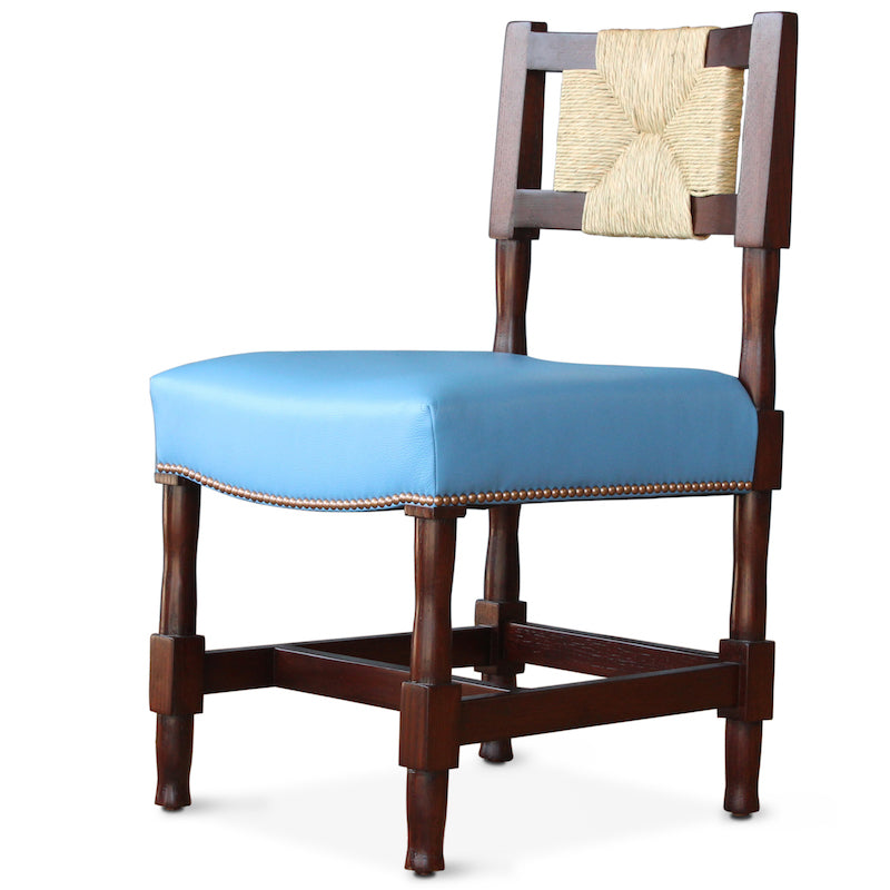 The Athletic Club dining side chair is a '40s twist on an Arts & Crafts classic. Remarkably comfortable, the chair is crafted from hand-turned solid oak and handwoven rush. Fabric is not included.