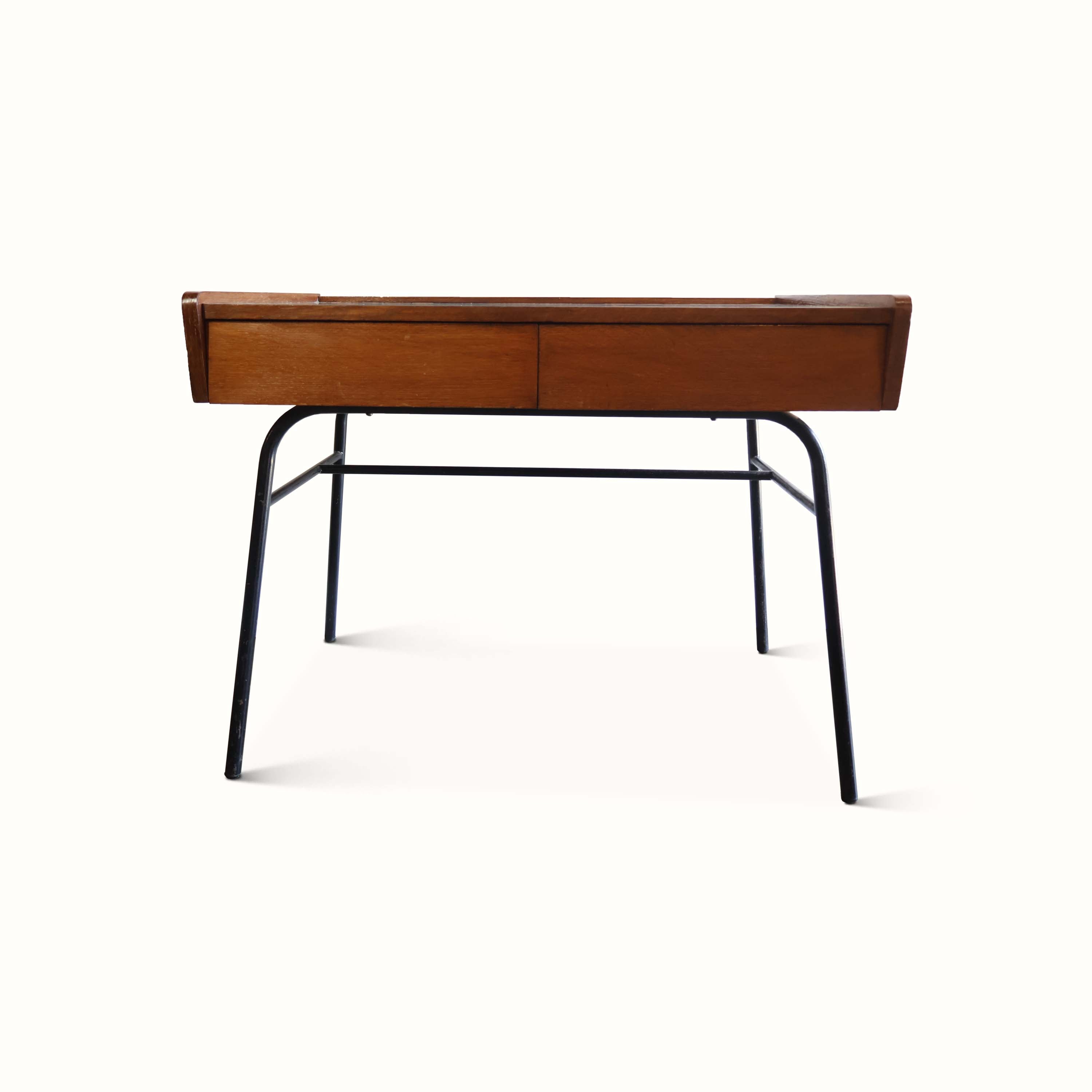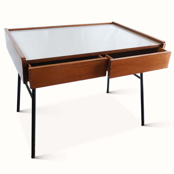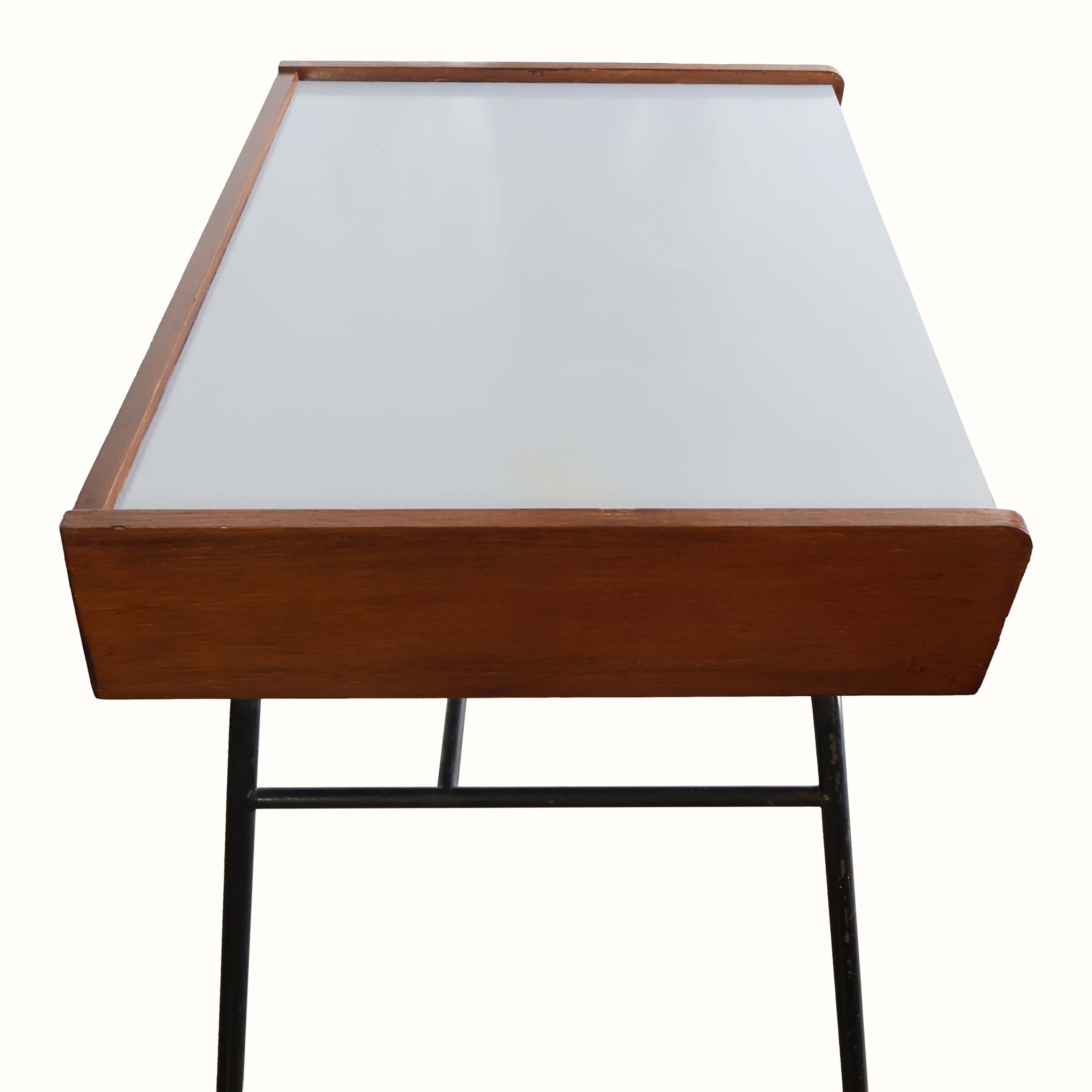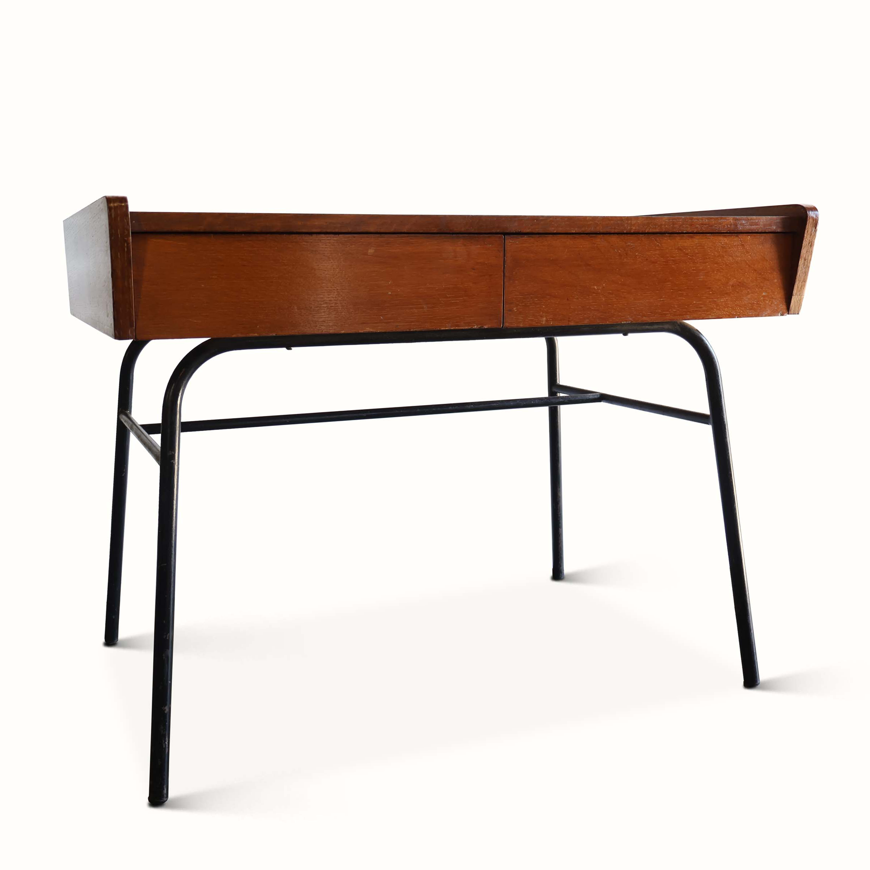 A vintage desk by Pierre Guariche, France, 1950s. Made of teak with a metal base and formica top. Newly refinished. Features two drawers. Metal base and formica top show minor signs of wear.