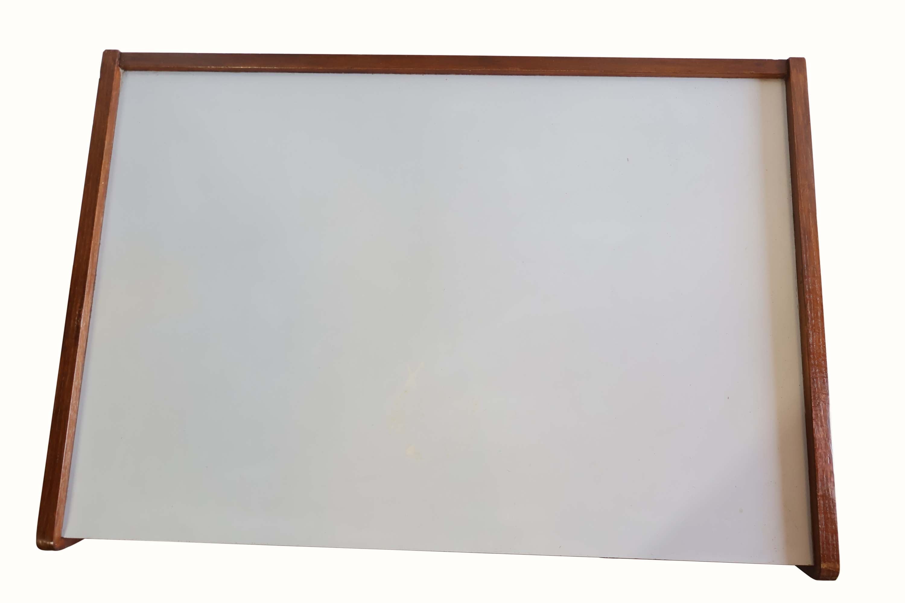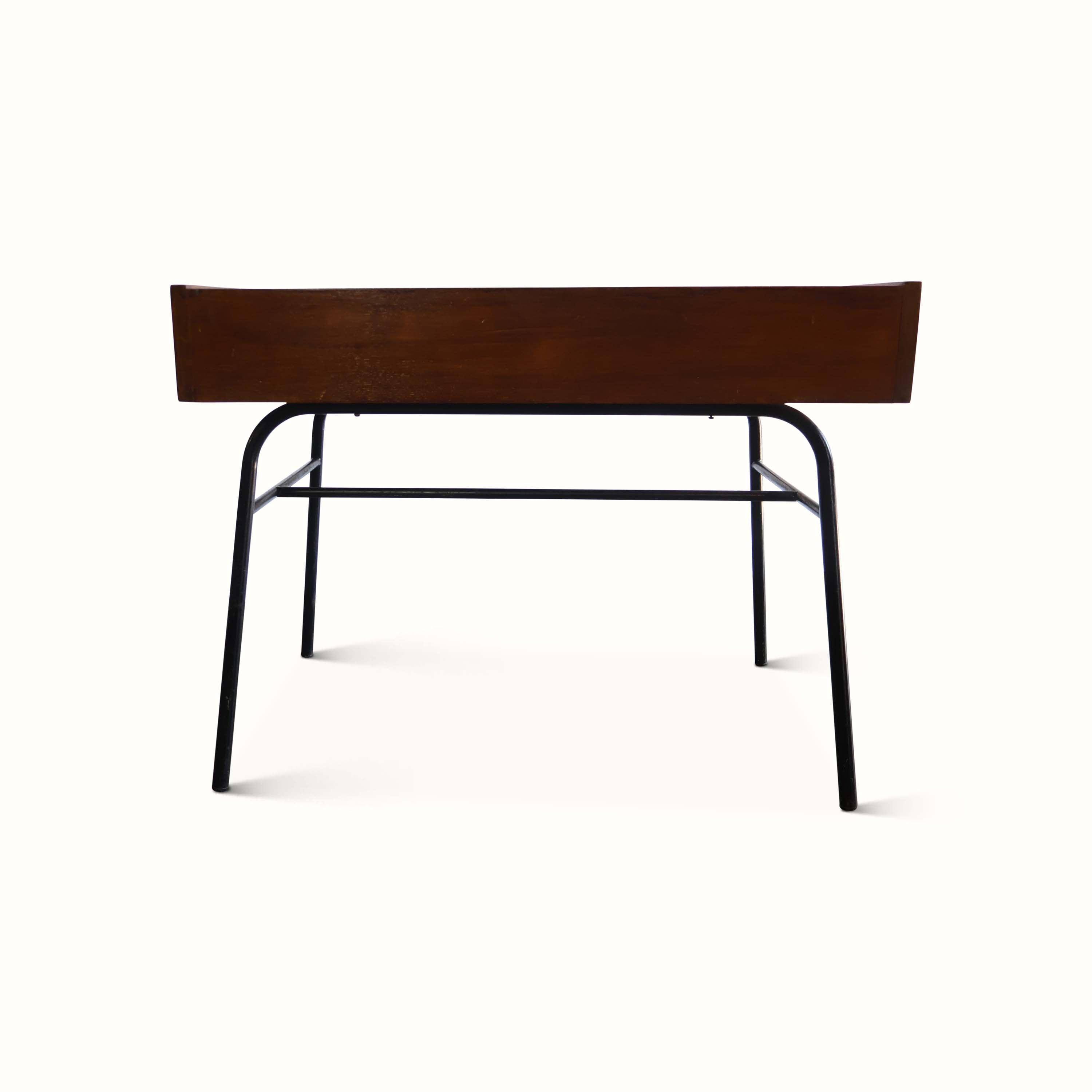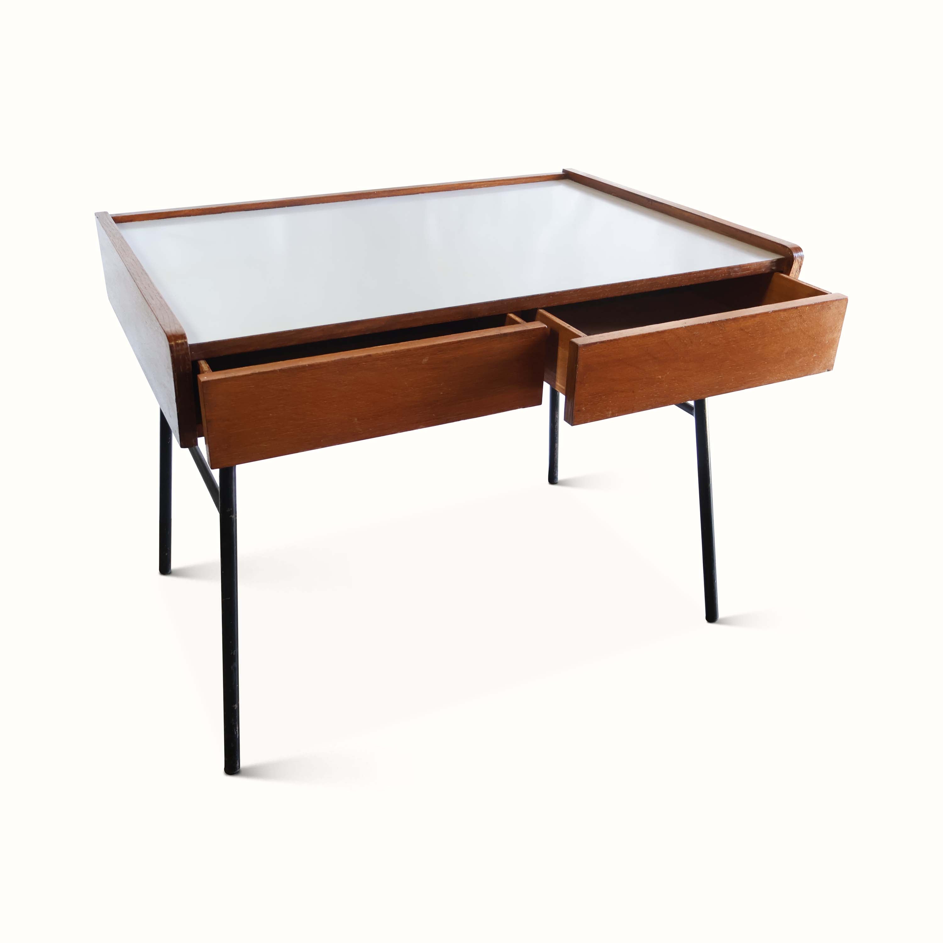 A vintage desk by Pierre Guariche, France, 1950s. Made of teak with a metal base and formica top. Newly refinished. Features two drawers. Metal base and formica top show minor signs of wear.
