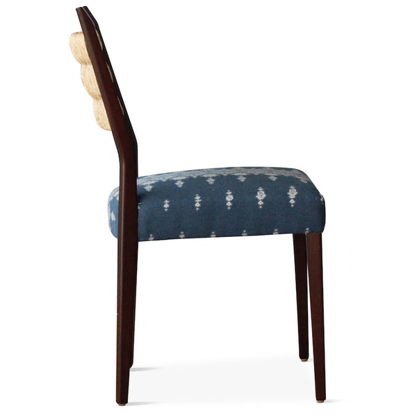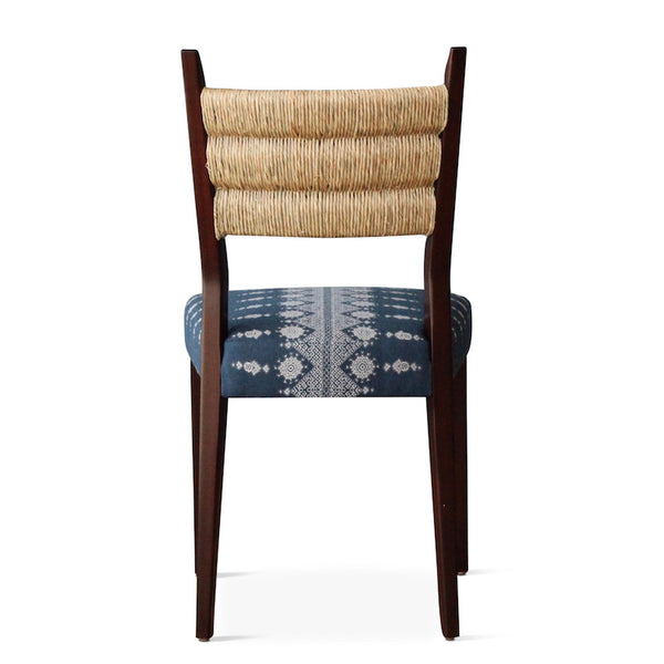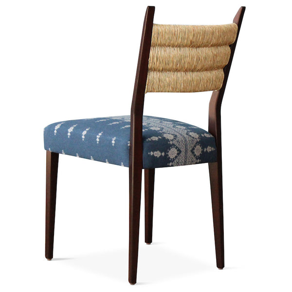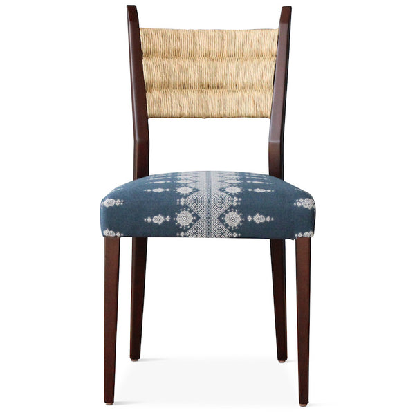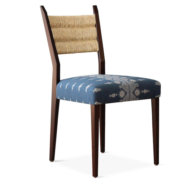 Our Silverlake side chair is handmade in Los Angeles with a solid wood frame, a handwoven rush back, and an upholstered seat. The chair adds vintage style to a dining area. The wood is available in a selection of standard finishes, and the seat can be upholstered in COM (customer's own material).