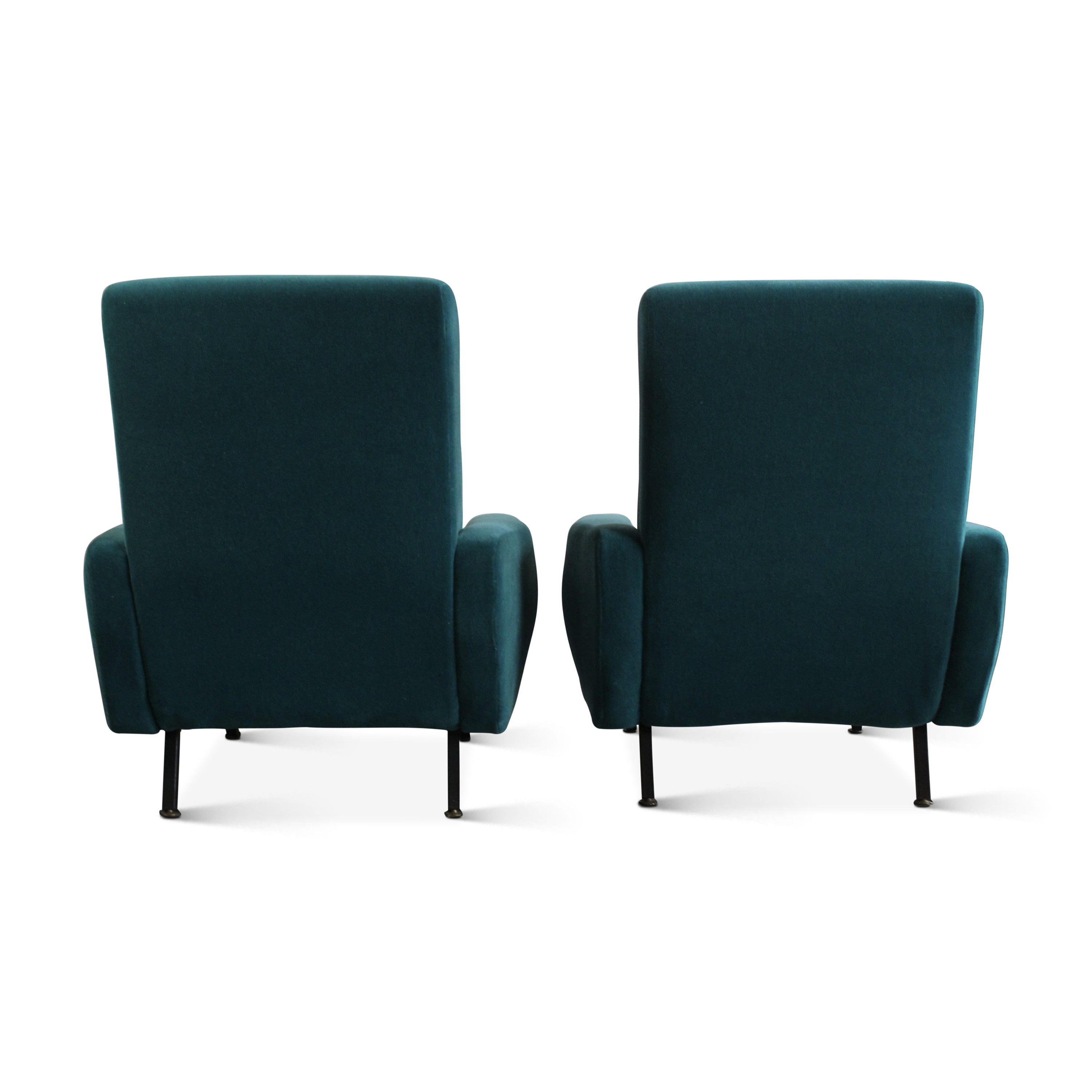 A pair of vintage lounge chairs by Pierre Guariche, France, 1950s. Newly restored in teal Italian mohair fabric with new foam and new cushions. Both are in excellent condition with patina to the metal legs.